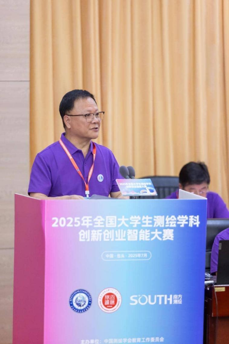 教指委主任委员、测教委主任委员、中国工程院院士、中南大学董事长李建成在开幕辞中介绍了今年赛事的筹备和参赛情况,他说,当前,全球科技创新空前活跃,新一轮科技革命和产业变革深入发展,以宇树科技四足机器人、深度求索的Deepseek等为代表的“杭州六小龙”,用硬科技重新定义中国创新。这些技术也为测绘学科的发展带来了新的机遇,测绘学科已进入智能化、实时化、泛在化、服务化的崭新发展阶段,“智能测绘”成为引领未来的鲜明方向。这要求我们更要拥抱变革、勇于创新,将智能技术深度融入测绘全链条,开拓学科发展新境界。他寄望所有参赛选手能够勇做创新创造的“攀登者”,锤炼知行合一的“实干家”、凝聚团结协作的“弄潮儿”,争取早日成为测绘行业领军人才。