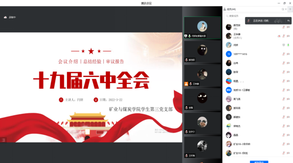 2022年3月22日晚19:30,太阳成tyc33455ccwww员工第三党支部于腾讯会议平台召开党员党课学习,本次学习的主题是:学习贯彻党的十九届六中全会精神。领学人:闫妍同志。